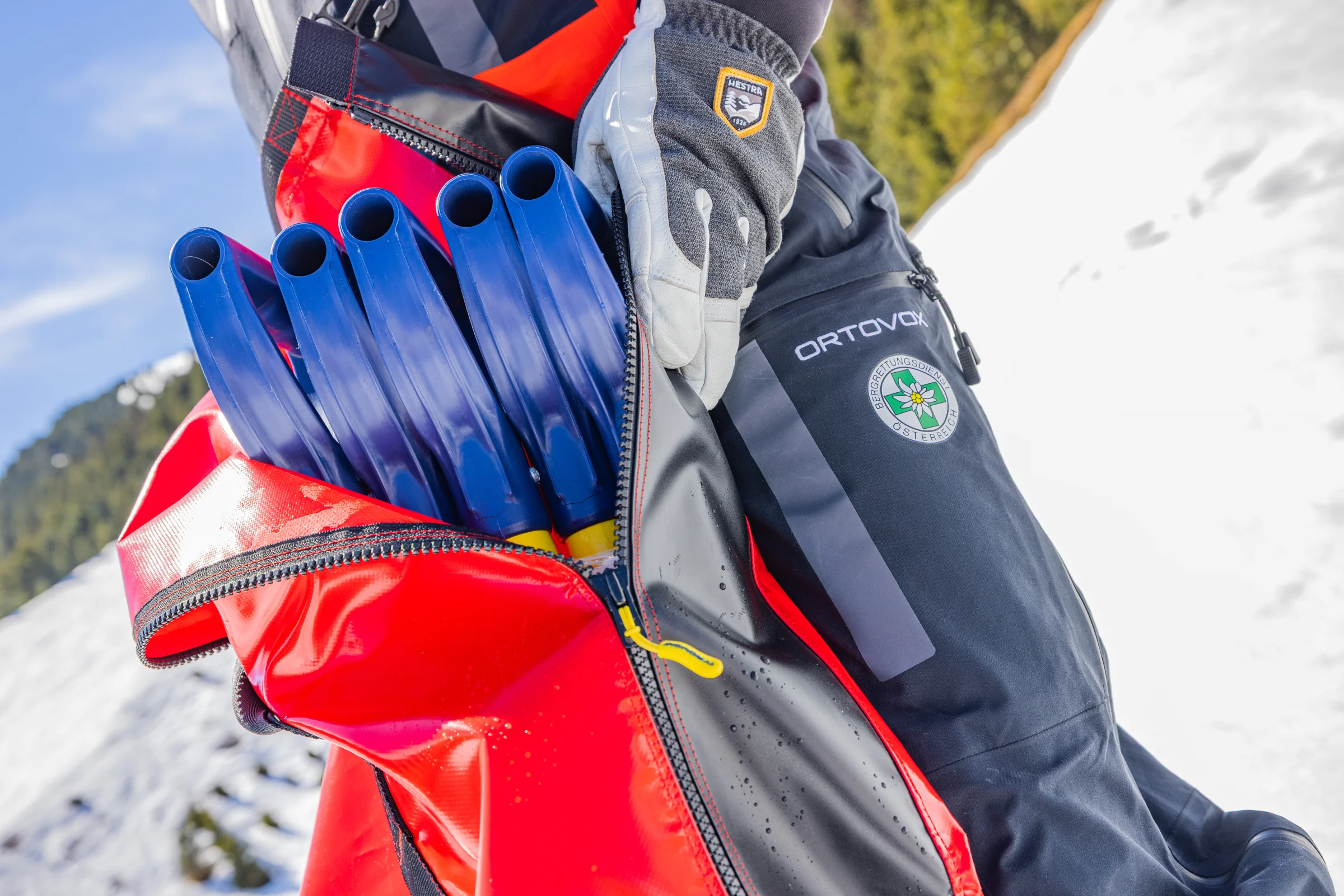 10 sets of aluminum probes. Assorted colors in red and black, each section 60cm - / probe parts with a total length of 4.2m - with the possibility of extension. Each can be extended if the probe is to be used for deeper snow depths. T-handle can be screwed on at the end for better handling when probing. The probe tip is permanently mounted.