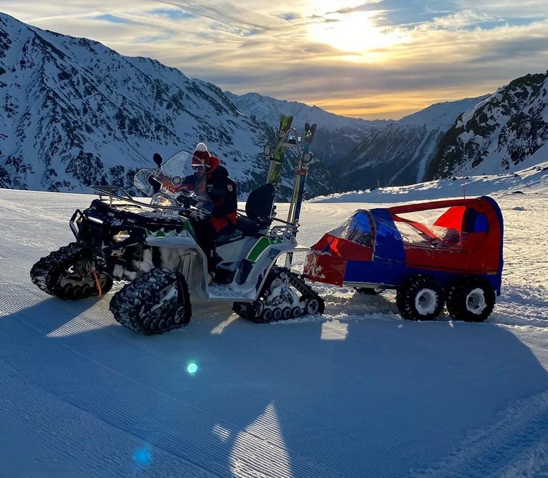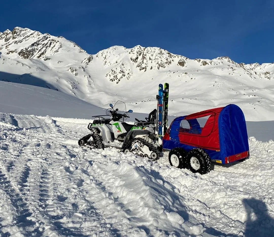 Hochwertiger, komplett ausgestatteter Rettungsanhänger für Quads und Schneemobile bietet optimalen Schutz des Verletzten gegen Regen, Wind und Kälte sowie im Winter bei aufgewirbelten Schnee.