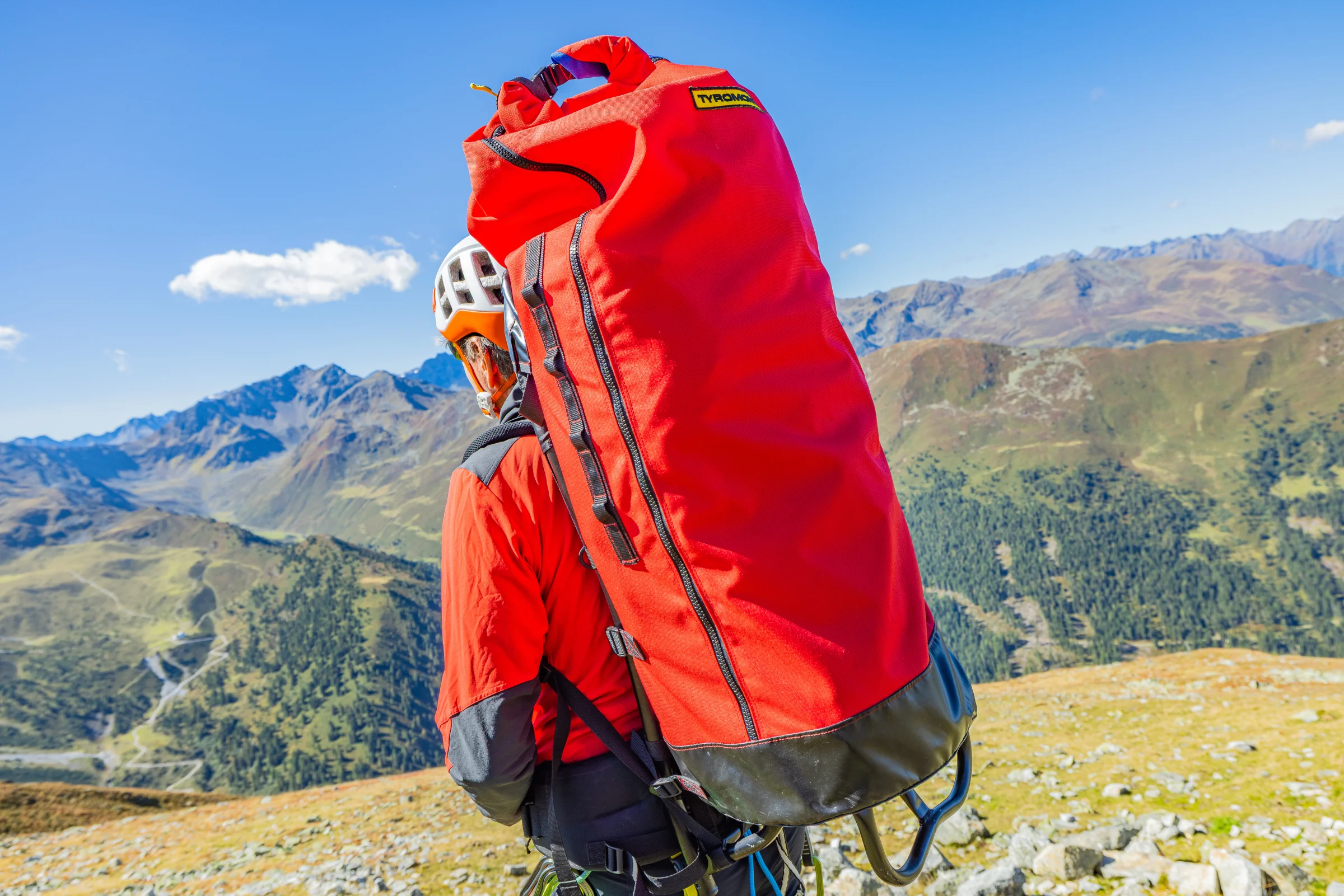 Der Transportsack TYRmove in Kombination mit der Tragekraxe vereinfacht und erleichtert das Tragen unförmiger und schwerer Lasten.