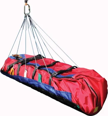 Kombination aus Luftrettungsssack, integriertem Rollröhren—Tragensystem und Rückhaltegurt zur Verletztenfixierung.